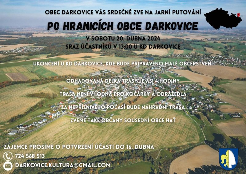 V sobotu 20. dubna 2024 se koná jarní pochod „Po hranicích obce Darkovice“. Sraz ve 13:00 hodin u kulturního domu. Ukončení u KD Darkovice, kde bude připraveno malé občerstvení.