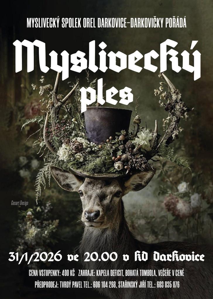 Myslivecký spolek Orel Darkovie-Darkovičky pořádá ples, který se uskuteční 31. ledna 2026 od 20:00. Vstupenky jsou k dispozici za cenu 400 Kč a zahrnují večeři. Na programu bude hudební vystoupení kapely Defigit a bohatá tombola. Pro více informací kontaktujte P. Tvadého nebo J.Stařinského.