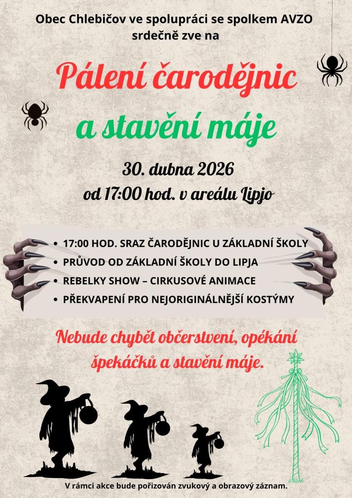 Pálení čarodějnic a stavění máje 30. dubna od 17 hod. v areálu Lipjo.