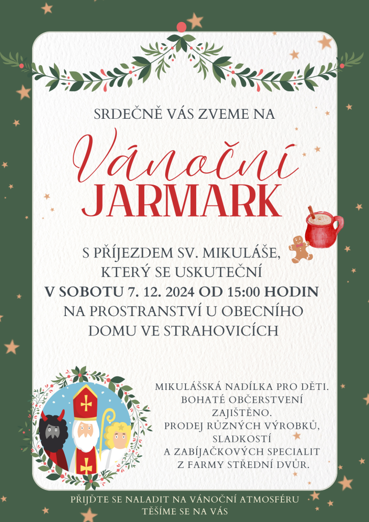 Srdečně vás zveme na S příjezdem sv. Mikuláše, který se uskuteční v sobotu 7. 12. 2024 od 15:00 hodin na prostranství u obecního domu ve Strahovicích. Můžete se těšit na Mikulášskou nadílku pro děti, bohaté občerstvení a prodej různých výrobků, sladkostí a zabíjačkových specialit z farmy Střední Dvůr. Přijďte se naladit na vánoční atmosféru!