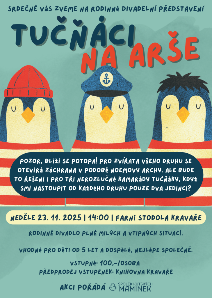 Tohle rodinné divadlení přestavení, které se uskuteční v neděli 23.11.2025 od 14:00 hod ve farní stodole si určitě nenechte ujít. Akci pořádá Spolek kutských maminek. Předprodej vstupenek v městské knihovně.