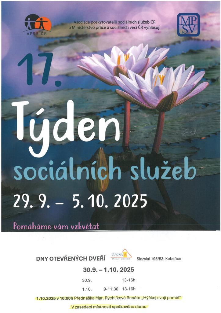 Týden sociálních služeb se koná od 29. září do 5. října 2025. Během tohoto týdne budou probíhat různé akce zaměřené na podporu a osvětu v oblasti sociálních služeb. Dne 1. října v 10 hod. bude přednáška "Hýčkejte svoji paměť". Všichni zájemci jsou srdečně zváni k účasti na těchto aktivitách, které přispějí k lepšímu porozumění a podpoře těchto důležitých služeb v naší společnosti. Těšíme se na vaši účast a aktivní zapojení.